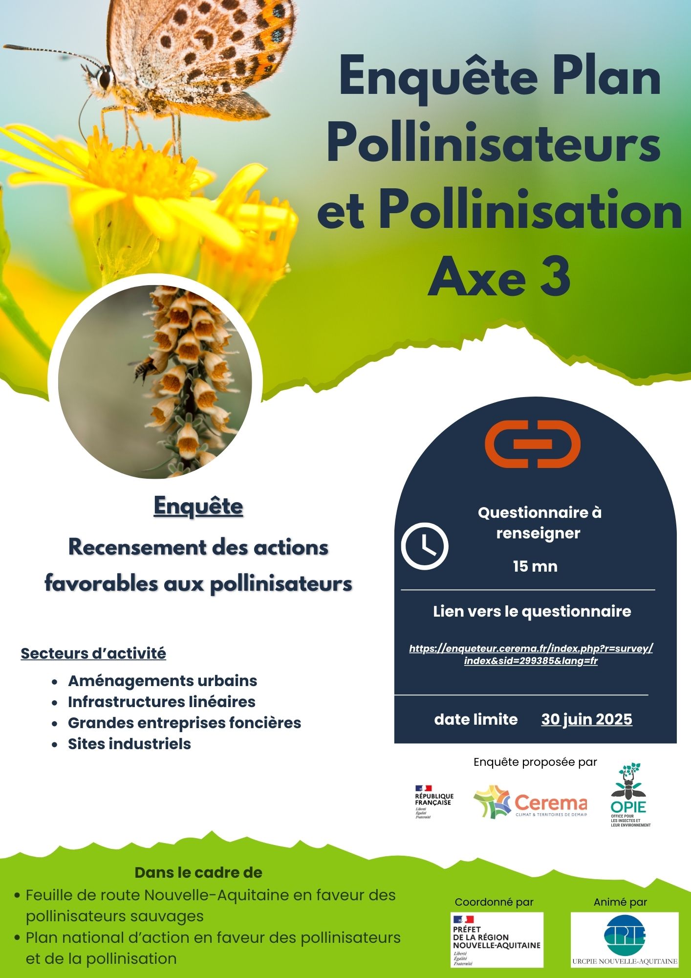 Dans le cadre de l'animation régionale du plan pollinisateurs, nous vous relayons cette enquête nationale relative à l'axe 3 du Plan national en faveur des insectes pollinisateurs et de la pollinisation (2021-2026). Un recensement des actions favorables aux pollinisateurs est effectué tous les deux ans par le Ministère en charge de la transition écologique (Ministère de la Transition Écologique, de la Biodiversité, de la Forêt, de la Mer et de la Pêche).