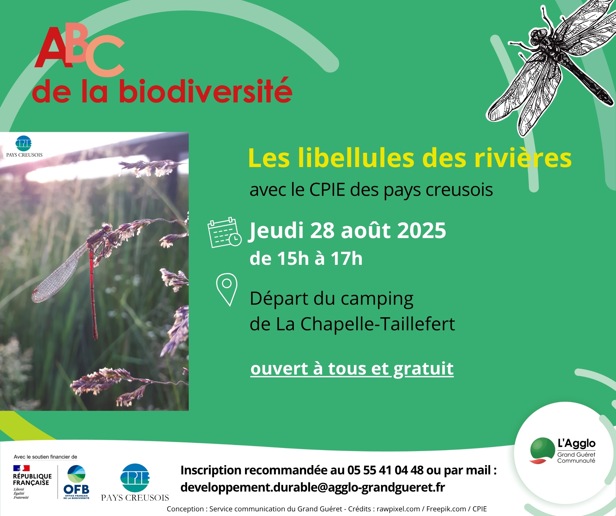 Dans le cadre de l’Atlas de la Biodiversité Communale de l’Agglo du Grand guéret, le CPIE vous invite à partir à la découverte des libellules des rivières, le long de la Gartempe, à la Chapelle Taillefert… l’occasion de participer à ce beau projet mais également de découvrir ces magnifiques insectes.